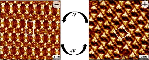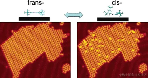 在扫描隧道显微镜的尖端和金属表面之间施加电场,可以将金属表面的偶氮苯衍生物可逆的反式-顺式异构化。