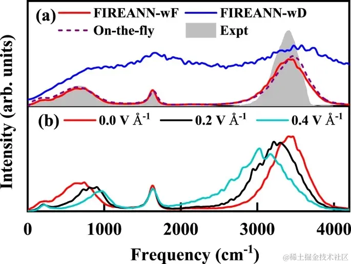 FIREANN 对无场 (a) 和有场 (b) 情况下液态水的光谱预测及与实验结果的对比
