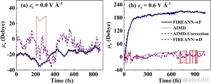 AIMD、修正后的 AIMD 和 FIREANN 对无场 (a) 和有场 (b) 时液态水的偶极矩分析