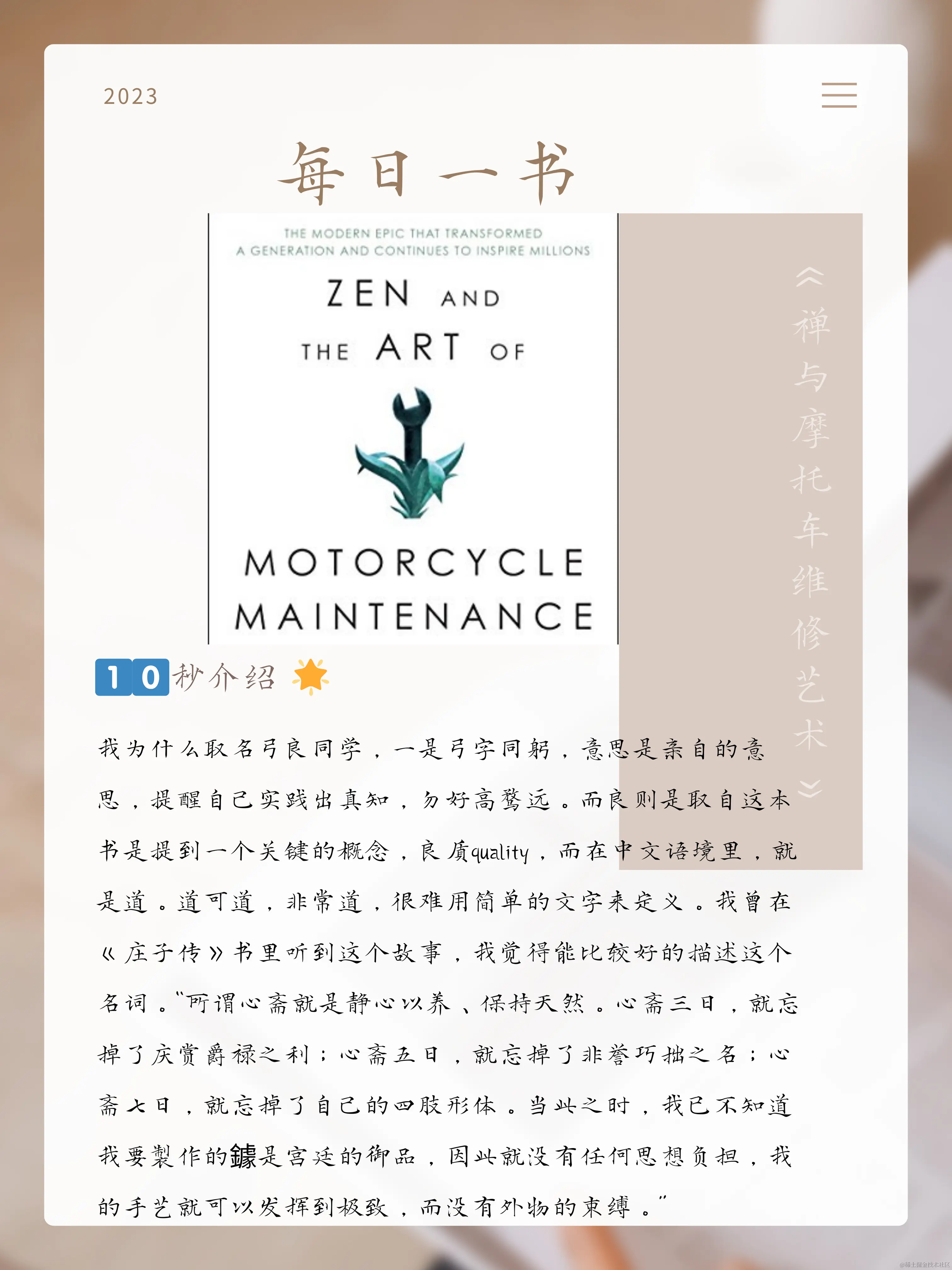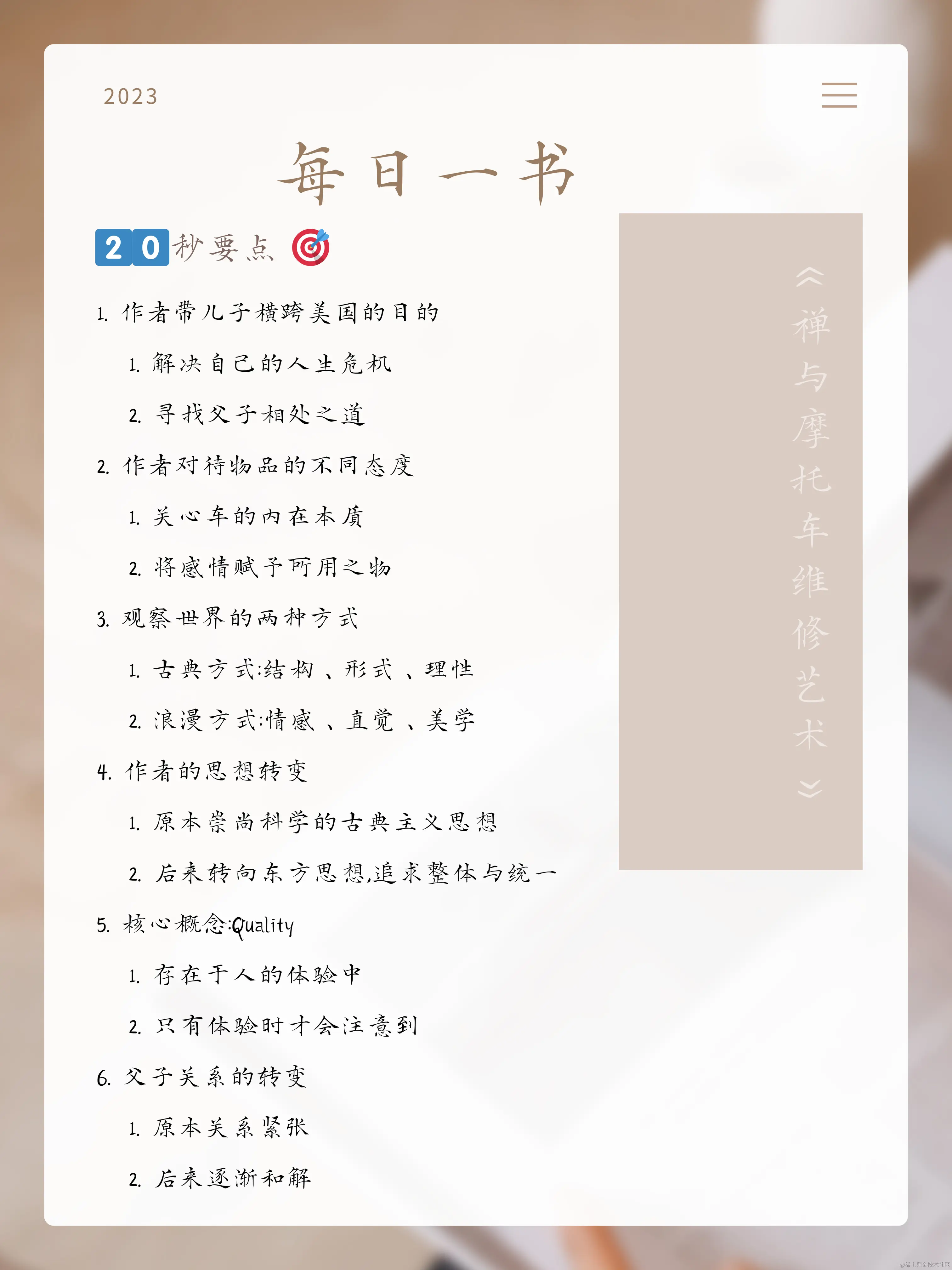 下面继续具体介绍这本书,这是对罗伯特·M·皮尔西格的书《禅与摩托车维修术》的全面摘要。涵盖了文本中的关键见解,并提出实现文本中提到的内容的实用方法。