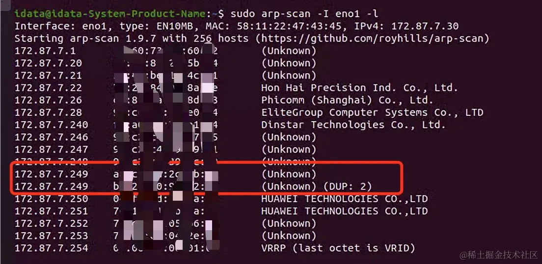 但是在排除上述可以排查的所有问题之后,我又把排查思路转义回到了这个问题上,并开始测试。这里使用的工具是 arp-scan。