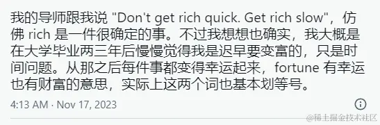 在 GEEKPLUX 的博文中读到了他关于慢慢变富的理念,他认为慢慢变富是在随机漫步的不确定中寻找那个确定性,并将财富增长归到了概率、确定性、长期、复利这些要点中。在这个节奏越来越快的社会中,随时还是免不了有一夜暴富的期望,但这篇文章也能给平凡的打工人一些思考。