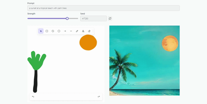 现在已经有很多根据提示词和草图来生成图片的服务,新发现的这个工具在此基础上还可以一边改草图和提示词一边实时生成效果,速度挺快,所prompt即所得。