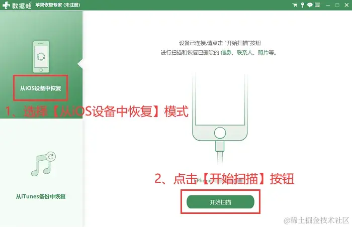 步骤2:选中【从iOS设备中恢复】模式后,点击【开始扫描】,可以直接扫描手机来恢复数据。