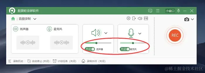 第2步:在音频录制模式中,这里可以打开或关闭麦克风和扬声器,并对它们的音量进行调节,根据自己的需求进行设置。