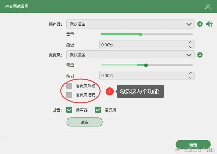 第3步:软件右上角有一个音量符号,这是声音调试功能,这里可以开启麦克风增强与麦克风降噪,并更改它们的默认设备。