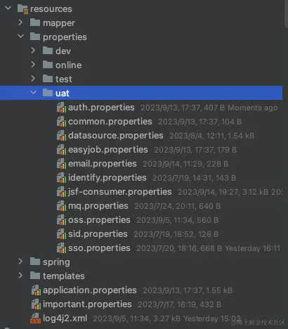 •properties文件夹:我们在properties文件夹下,基于不同的环境,简历单独文件夹,比如dev,online, test, uat等,每个文件夹下存放当前环境的配置信息。