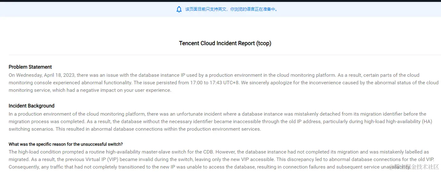 同时腾讯云竟然海外版还会专门写一篇详尽的事件报告,反而国内这块每次只是相当于发布一个公告而已,让人很是困惑。