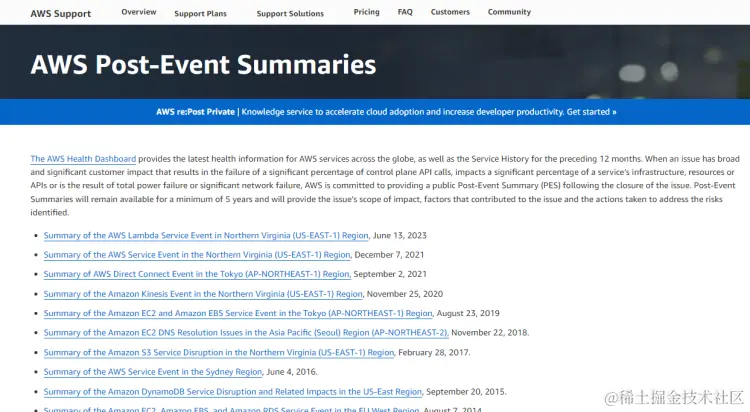 截止23年11月份底,官网目前保留的事后摘要一共16篇,从2011到2023年跨度。这些事故可以说AWS中影响比较大的事故了,推荐大家有时间阅读下,尤其是云计算从业者,可以说这些资料都是很有用处的,学习前人踩过的坑,有益于自己避坑。