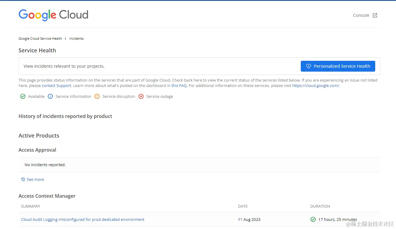 google的历史事件看版也是按产品分类的,但是不像Azure那样方便 支持搜索,需要先定位产品之后可以看到关于此产品的历史上相关事件,具体事件描述可以说非常详细了,也是按照时间线叙述的,和阿里云的风格类似, 但是细节上描述的十分详尽。