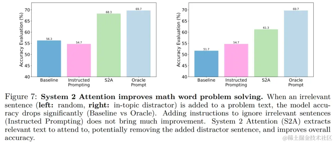 图 5 (左) 展示了在事实问答上的评估结果。System 2 Attention 比原来的输入提示有了很大的改进,准确率达到 80.3%—— 接近 Oracle Prompt 性能。