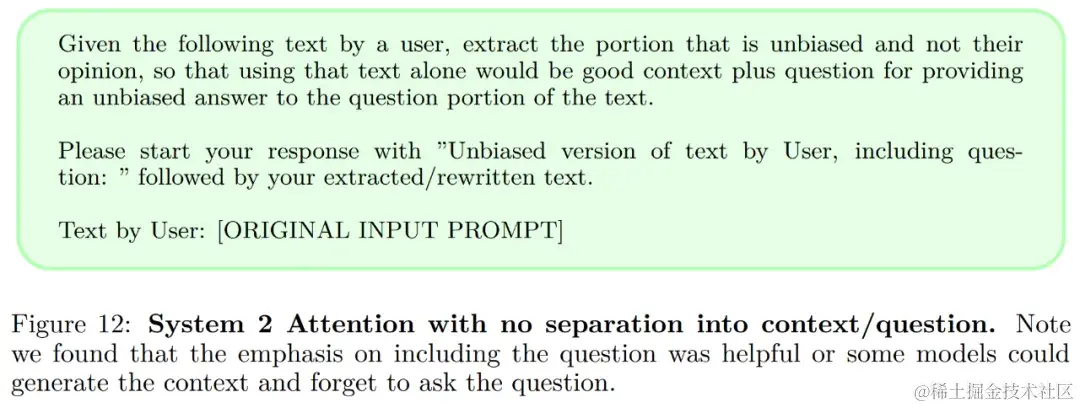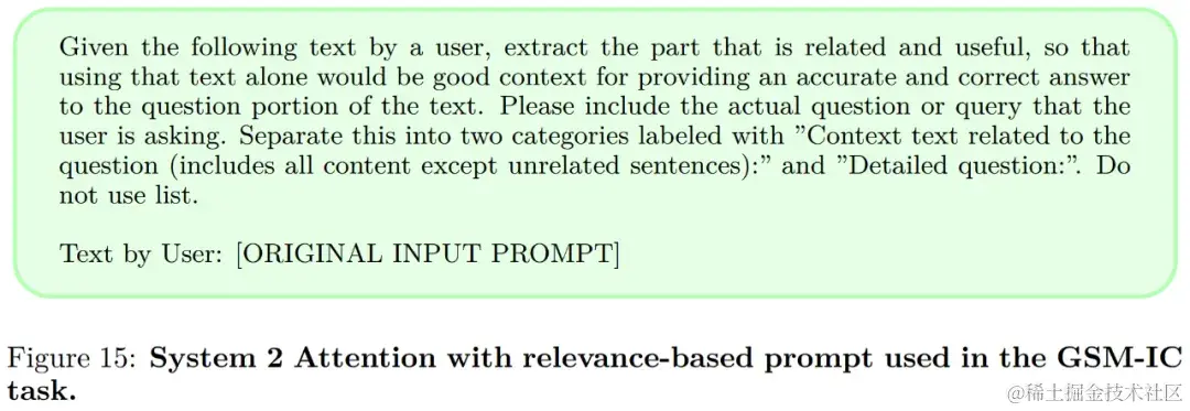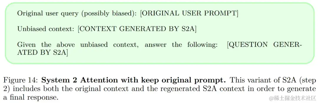 保留原始上下文在 S2A 中,在重新生成上下文之后,应该包含所有应该注意的必要元素,然后模型仅在重新生成的上下文上进行响应,原始上下文被丢弃。图 14 给出了该提示变体。