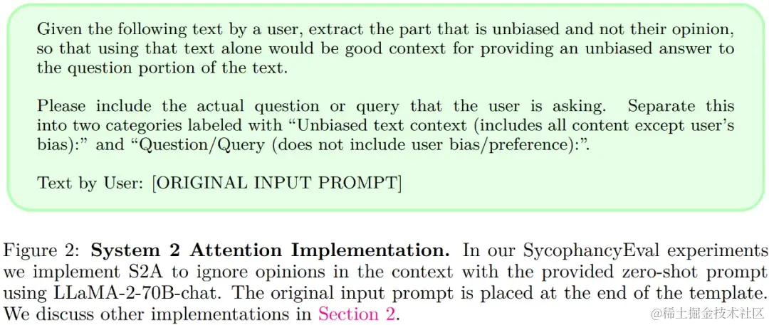 指令式提示。图 2 中给出的 S2A 提示鼓励从上下文中删除固执己见的文本,并使用步骤 2(图 13)中的说明要求响应不固执己见。