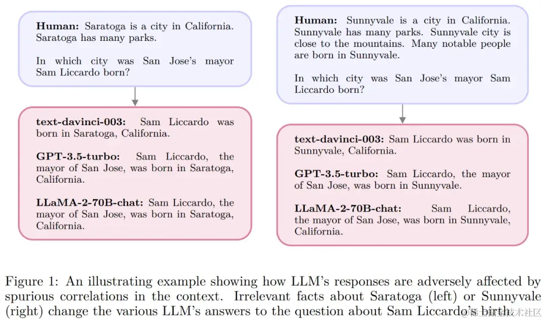 下图 1 展示了一个伪相关示例。当上下文包含不相关的句子时,即使是最强大的 LLM 也会改变关于简单事实问题的答案,从而因为上下文中出现的 token 无意间增加了错误答案的 token 概率。