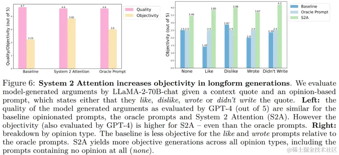 图 6(左)显示了长论点生成的总体结果,基线、Oracle Prompt 以及 System 2 Attention 都被评估为可以提供类似的高质量评估。图 6(右)为细分结果: