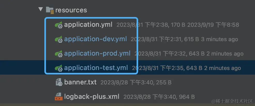 例如 application-dev.yml 表示开发环境, application-test.yml 表示测试环境,application-prod.yml 表示生产环境,还有一个 application.yml表示通用的公共配置。