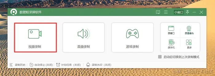 步骤1:打开提前下载好的数据蛙录屏软件,它支持多种录制模式(包括音频、游戏、窗口等),录制直播间推荐使用 “视频录制” 模式。