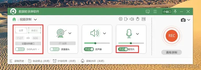 步骤2:在视频录制模式中,左侧可以设置直播录屏的范围,如果想要录入人声,记得提前开启麦克风,并对音量进行调节。