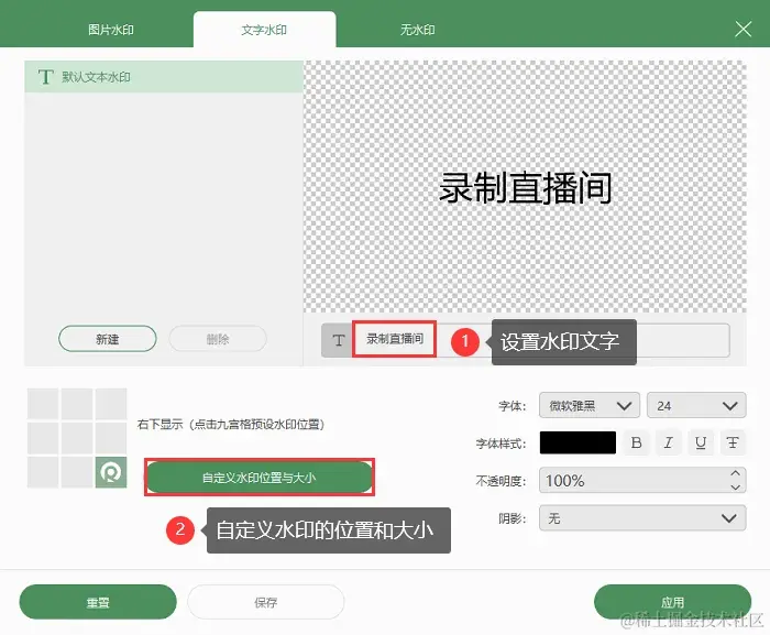 步骤3:页面下方可以开启录制水印功能,点击管理水印,添加自己喜欢的文字水印或图片水印,并对它们的位置和大小进行设置。