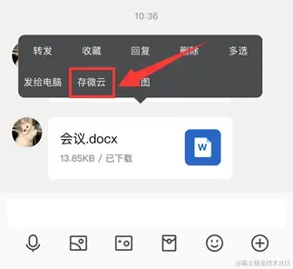 步骤2:在弹出窗口中点击【存微云】选项,这时,手机会自动将文件上传到微云当中。