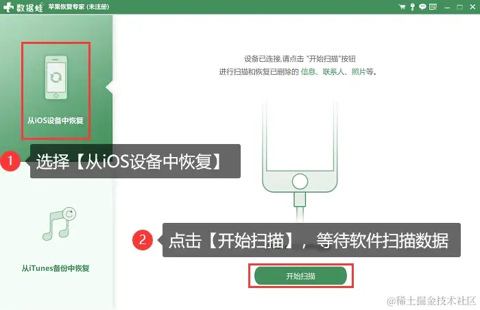 步骤2:打开软件,选择【从iOS设备中恢复】选项,然后点击【开始扫描】。在扫描过程中,请勿随意断开手机与电脑的连接,以免造成数据丢失。