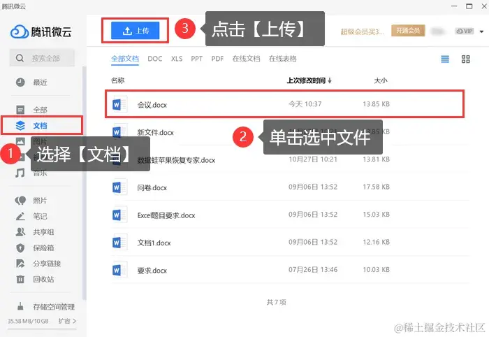 步骤4:在左侧列表中选择【文档】选项,找到并选中刚刚同步的文件,然后点击上方的【上传】按钮即可将文件保存在电脑上。