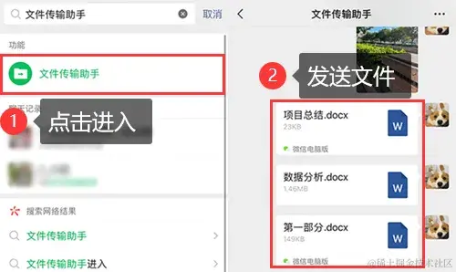 步骤2:打开手机微信后,点击主界面上方的搜索栏,输入【文件传输助手】并点击进入其工作页面,然后向其发送需要传输到电脑上的文件。