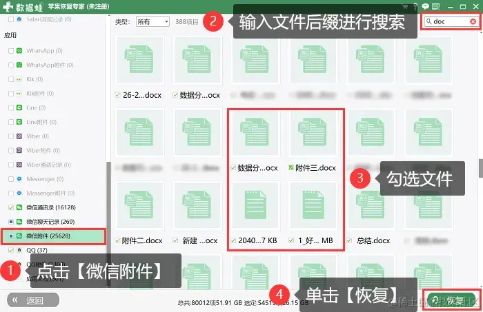 步骤3:在数据扫描完毕后,软件界面找到并勾选所需文件(QQ附件或者微信附件),然后点击【恢复】按钮,选择保存位置,等待恢复完成即可。