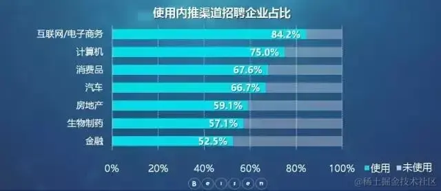 内推,作为获取人才的一种反式已经越来越被各行业企业所接受。平均超过66%的企业愿意使用内推渠道,互联网更是有超过84%的企业接受内推招人的方式。