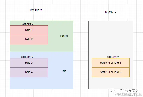 从这里看出,我们的JVM中,对象全是 MyObject,只不过它的成员变量表里面储存的东西不一样而已。