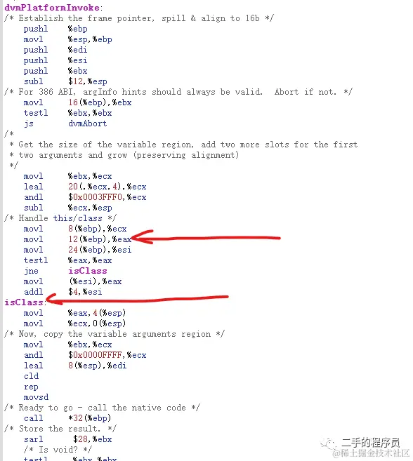从这里开始,逻辑就变得稍微抽象了点,但是还是能大致看明白的,这个方法就是在获取一些参数的值,好传递给 method 的 nativeFunc 变量。再往下面,就需要看 dvmPlatformInvoke 代码了,这个方法的实现与平台有关,参数的传递在汇编里面都不太一样,看个例子: