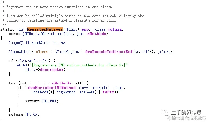 env->RegisterNatives(clazz, gMethods, numMethods)是一个接受三个参数的函数,第一个参数是Java对应的类,第二个参数是JNINativeMethod数组,第三个参数是JNINativeMethod数组的长度,也就是需要注册的方法的个数。其中JNINativeMethod表示的是方法方法的映射关系,它包括Java中的方法名,对应的方法签名和Native映射的函数方法三个信息。