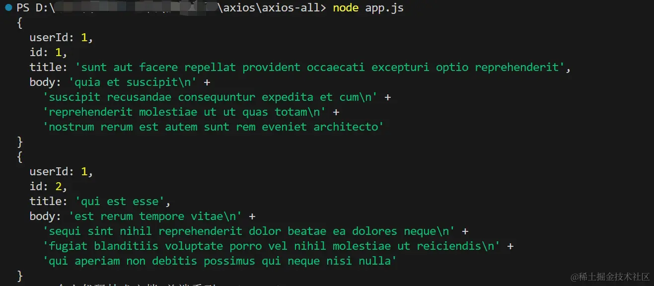 上面的示例利用 Axios 的并发请求功能,通过 axios.all 并发发送两个 GET 请求到 JsonPlaceholder 提供的 REST API 端点,然后使用 axios.spread 将响应结果拆分开来,从中取出 postData 信息打印输出,以此演示 Axios 如何通过 Promise 机制让我们可以方便地发起多个请求并行处理响应。其结果如下: