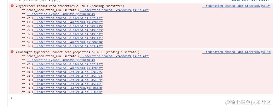 期间尝试了无数次痛骂gpt、对比依赖版本号、直接复制node_modules、debug源码,终于确认了根源是宿主程序与远程程序没有共用同一个React实例,但是问题并不出在配置与依赖版本上,而是因为动态导入。如果直接使用静态导入的import,则两个程序是共用一个实例,但走动态的import时,就会重新创建一个react实例。在实际开发过程中,我是先写angular再写react,angular版本的mf有提供一个loadRemoteModule,可以丝滑动态载入远程项目,但是我在vite-plugin-federation没有找到类似的导出方法。