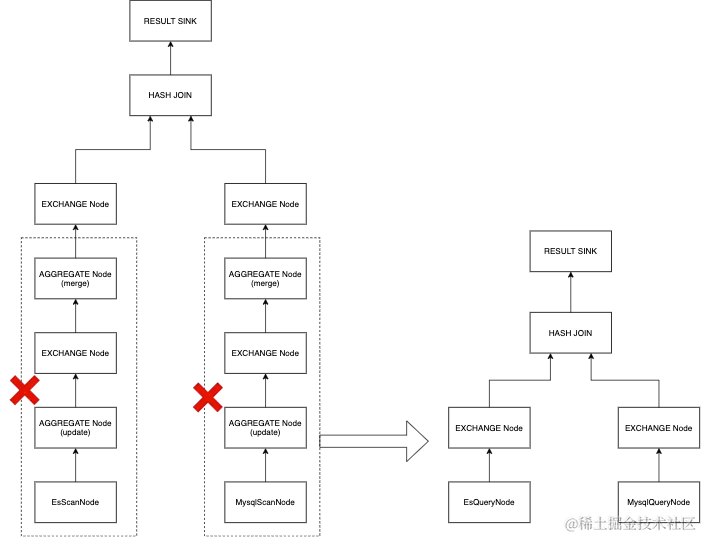 在物理执行计划层我们做了再次优化,当遇到ES、Mysql、clickhouse的聚合造作时,会把ScanNode+AGGNode的执行计划优化为QueryNode,QueryNode为一种特殊的ScanNode,与普通的ScanNode区别为QueryNode会直接把聚合查询请求直接发送到对应外部引擎,而不是scan数据后在本地执行聚合。其中EsQueryNode我们会在FE端就生成ES查询的DSL语句,直接下推到BE端查询 。在同时在BE端我们实现了EsQueryNode 和MysqlQueryNode这两种QueryNode。