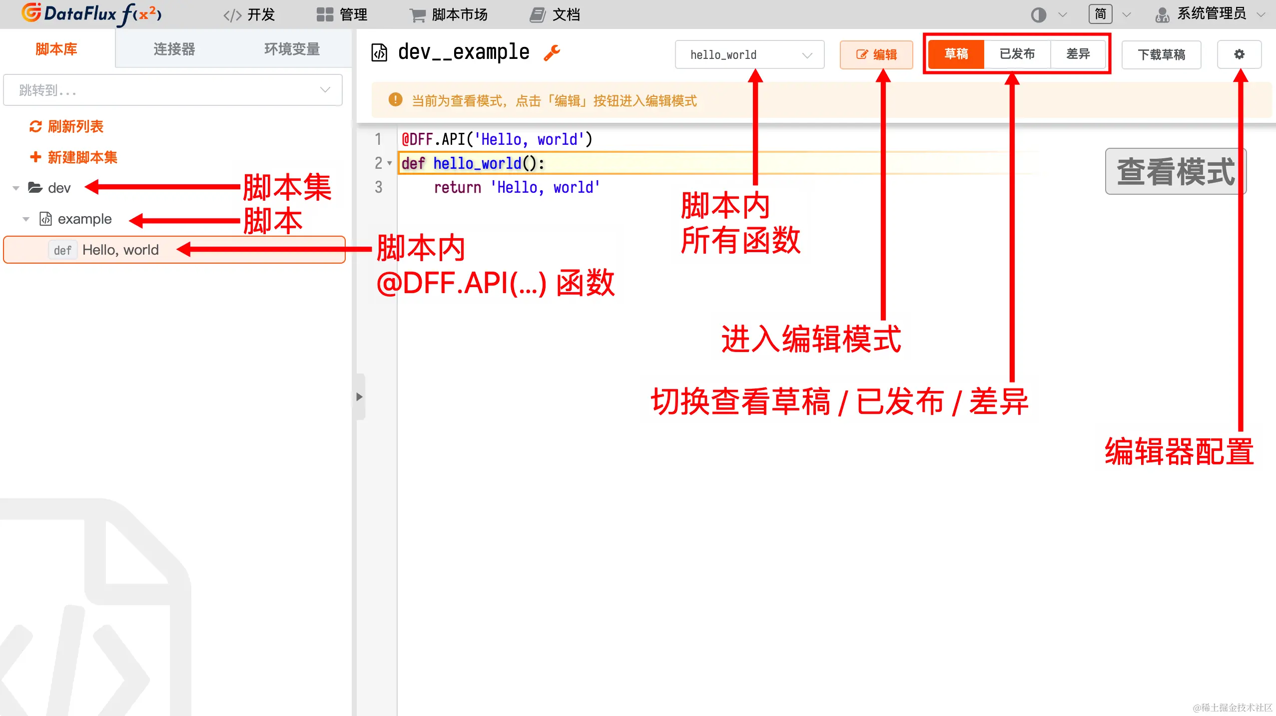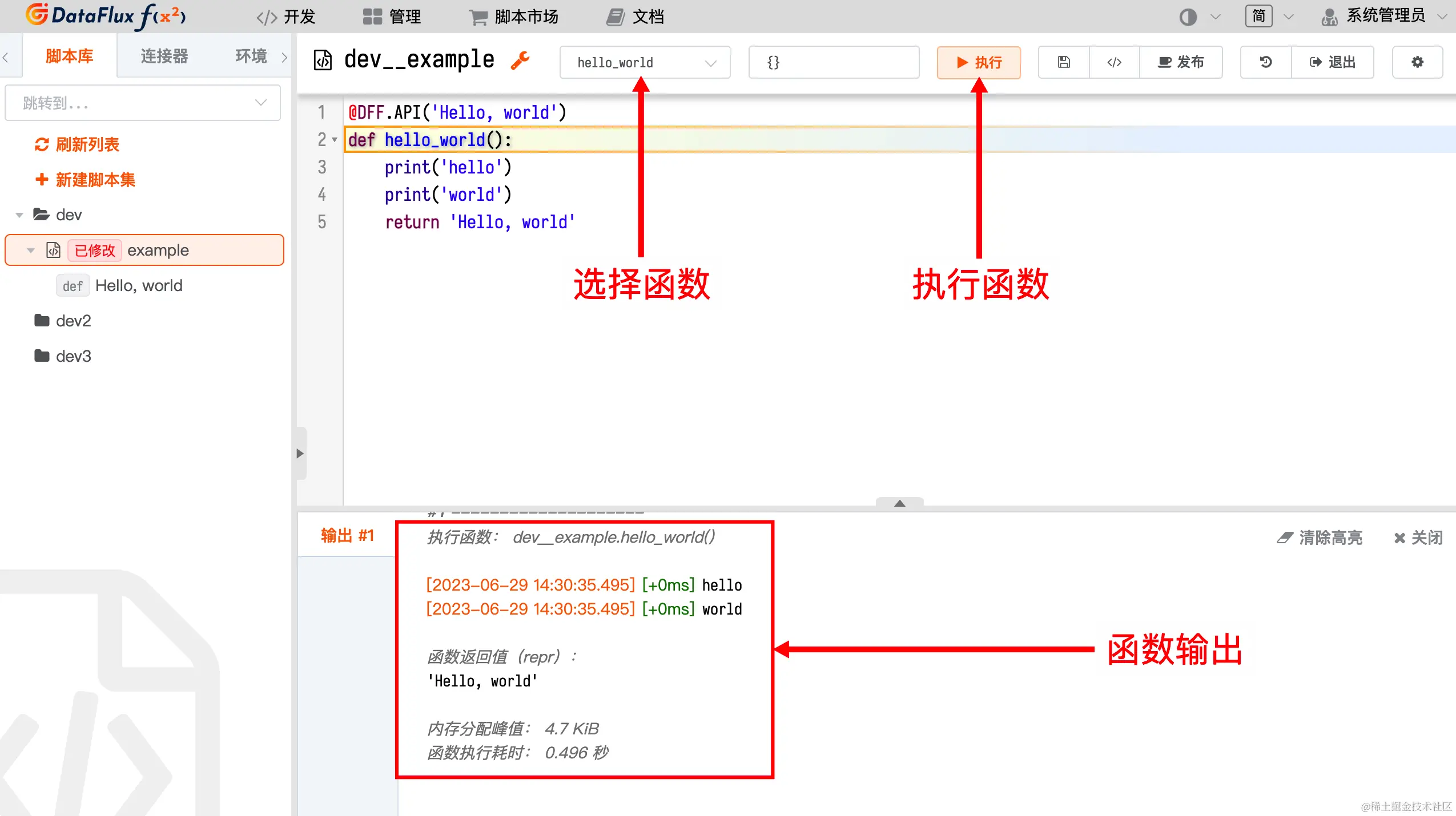 DataFlux Func提供了完善的脚本开发功能支持,在完成数据的整合接入后,开发者可以在Func编辑器界面对数据处理过程进行开发调试。其中开发脚本库的代码编辑器界面提供代码提示、函数提示、自动补全等功能,发布功能提供语法检查、版本发布更新等功能,方便用户编写及发布相关代码。