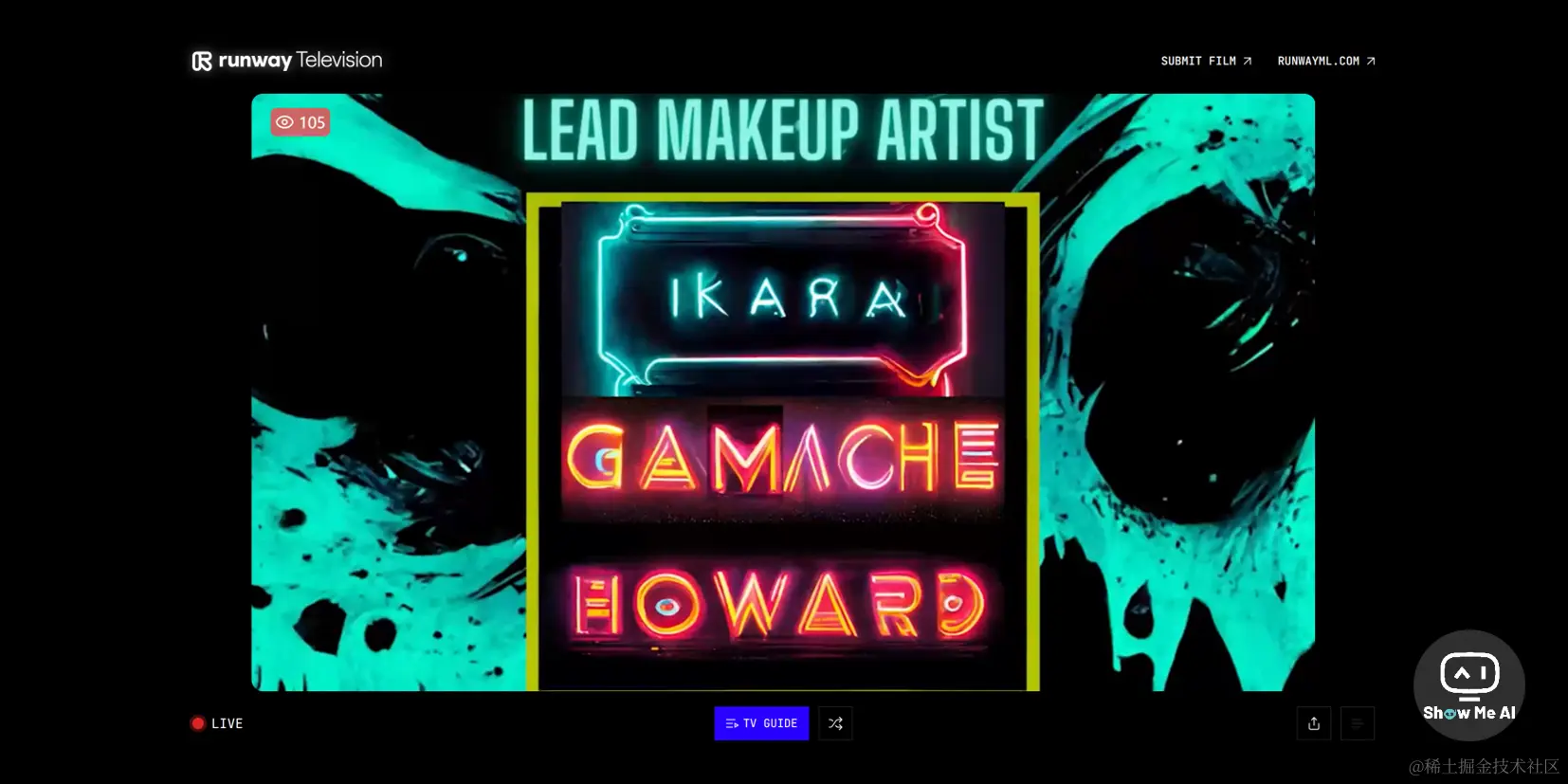Runway 在其官网推出一个TV频道,实时循环播放由AI制作的视频。点击页面下方的「TV Guide」按钮还可以从官方提供的10多个候选频道中进行选择,并点击节目开始播放。