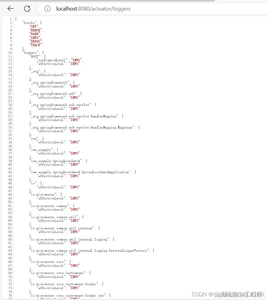 例如查询日志信息数据,访问localhost:8080/actuator/loggers