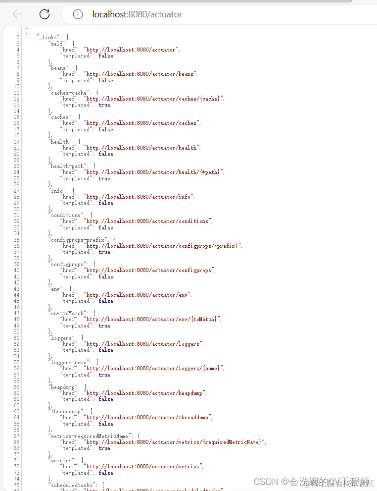 可以看到有很多json格式的字符串,这些都是该路径下的相关资源信息,并且通过URL可以调用actuator的功能: