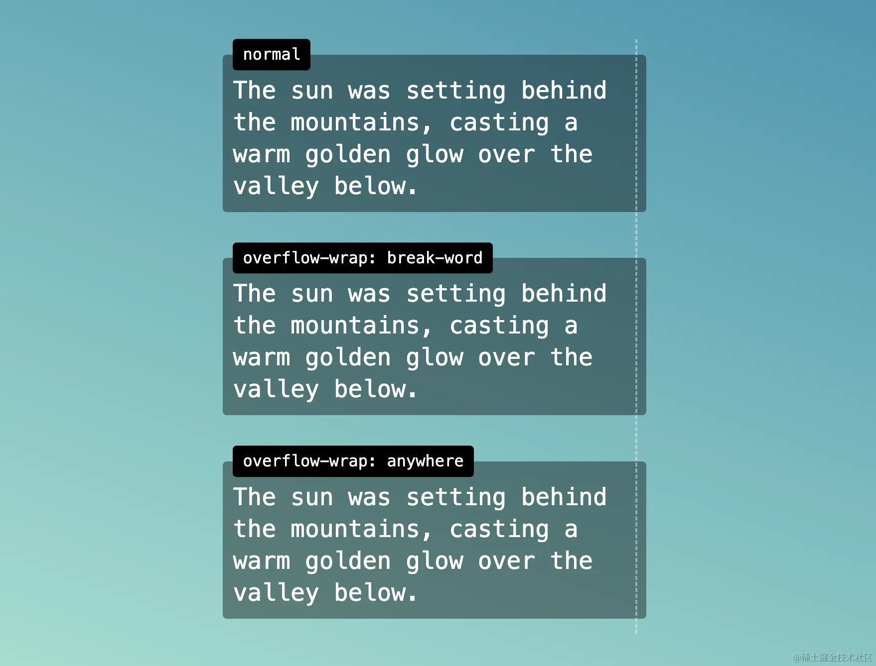 学完 overflow-wrap,你可能会联想到另外一个 CSS 属性 word-break,它们都用于控制文本的换行行为,但它们的工作方式有所不同: