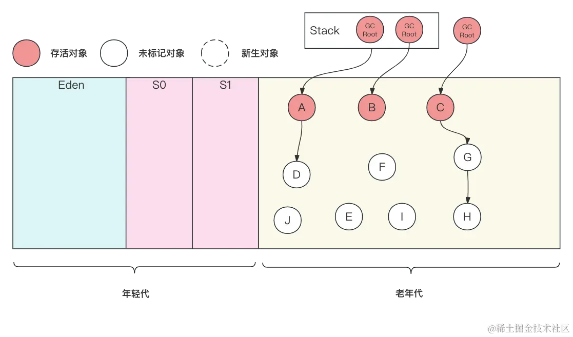 由于GC Root直接关联的对象小,因此可以快速的将这些对象标记出来,以减少“Stop The World”的时间。如上图所示,只标记了处于栈或者其它地方的GC Root直接关联的对象A、B、C,将这些对象标记成为存活。
