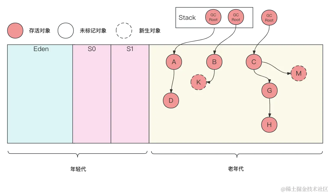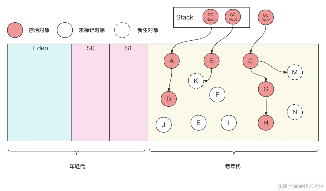 这些新的对象可能与GC Roots相连是存活对象,如K、M;也可能不与GC Roots相连接,是垃圾对象,如N。JVM会通过Card(卡片)的方式将发生变化的老年代区域标记为“脏”区域,也就是所谓的卡片标记(Card Marking)来对新增对象的存活状态进行重新标记。