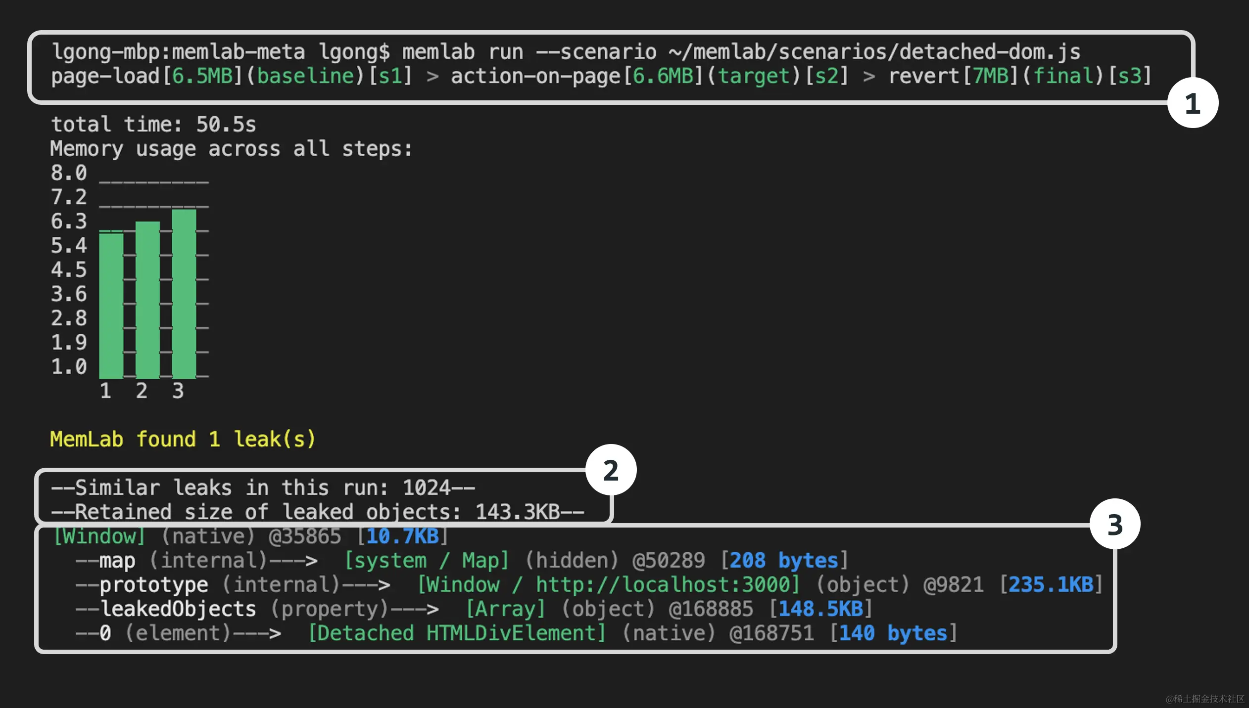 Memlab 运行完成后,所有结果和数据将保存在指定的工作目录中(workDir),可以使用内置的结果分析器BrowserInteractionResultReader对结果进行读取并输出。