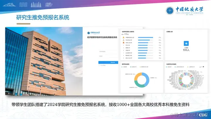 此外,在科研管理方面、项目管理、研究生的招生、培养、管理等方面都分别做了数字化管理。我们还建立了资源中心,不过还在不断完善中。未来,我们将运用大模型和AI技术,整合学术资源,构建具有地大特色的经管知识库,辅助老师和学生终身学习。