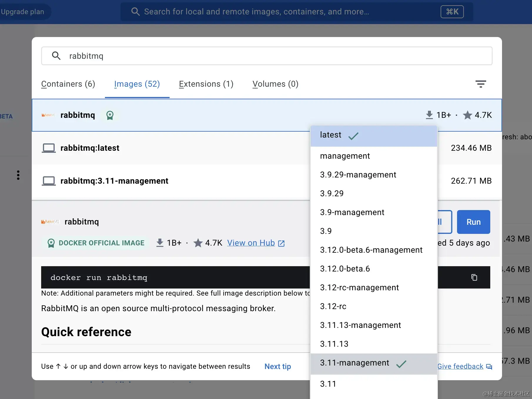 搜索 rabbitmq 的镜像,选择 3.11-management 的版本: