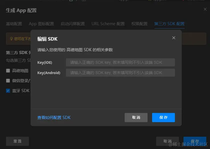 通过配置第三方SDK可以使 App 获取一些扩展能力,比如高德地图/微信登录等。