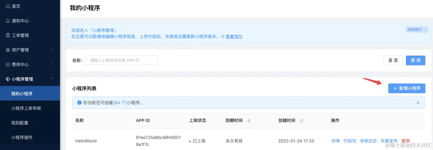 登录FinClip 后台,在小程序管理->我的小程序新增一个小程序。