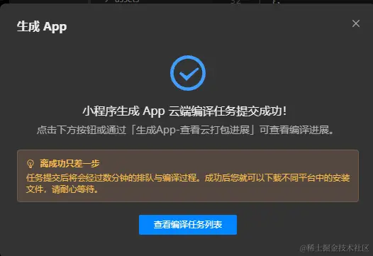 点击查看编译任务列表->查看云打包进展->成功后点击下载安装包并安装运行即可。