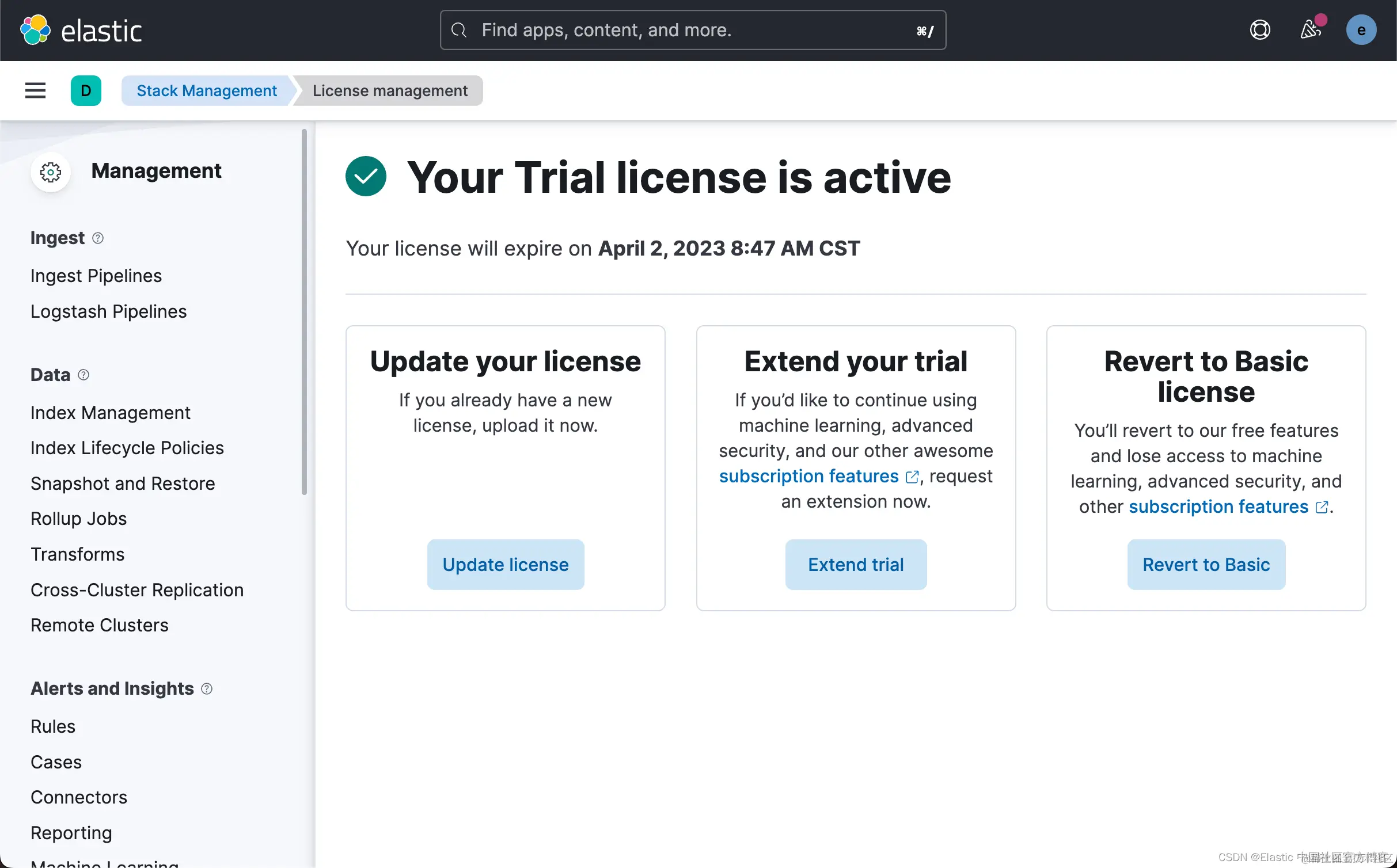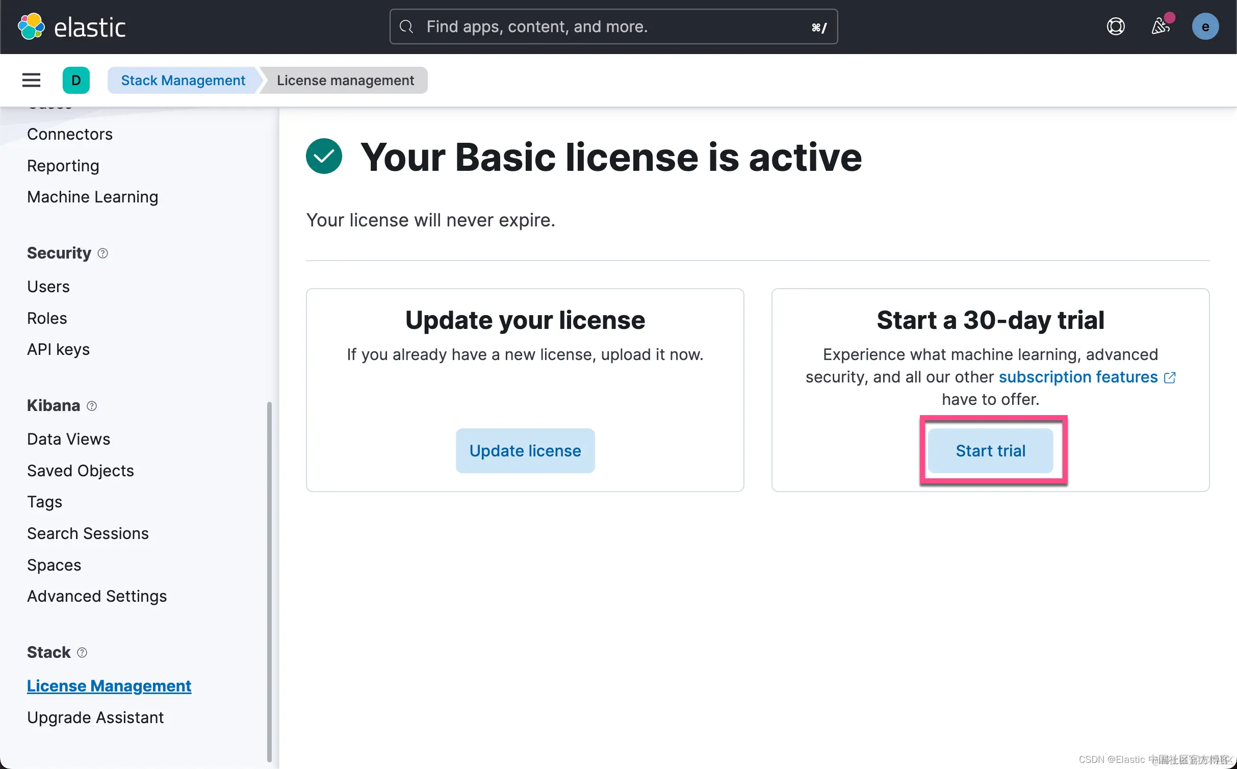 由于上传模型是一个白金版的功能,我们需要启动试用功能。更多关于订阅的信息,请参考网址:订阅 | Elastic Stack 产品和支持 | Elastic。