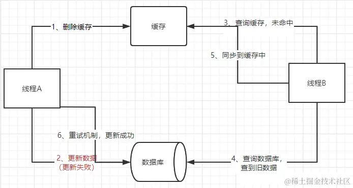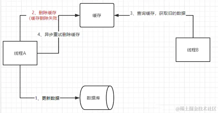 如果出现这样情况: 1、线程A更新数据库中的数据 2、线程A删除缓存中的数据,删除失败 3、线程B查询缓存中的数据,查询到旧数据 4、线程A异步重试删除缓存 这里,删除缓存中数据失败后就会造成线程B获取到缓存中的旧数据,从而导致数据不一致的情况。